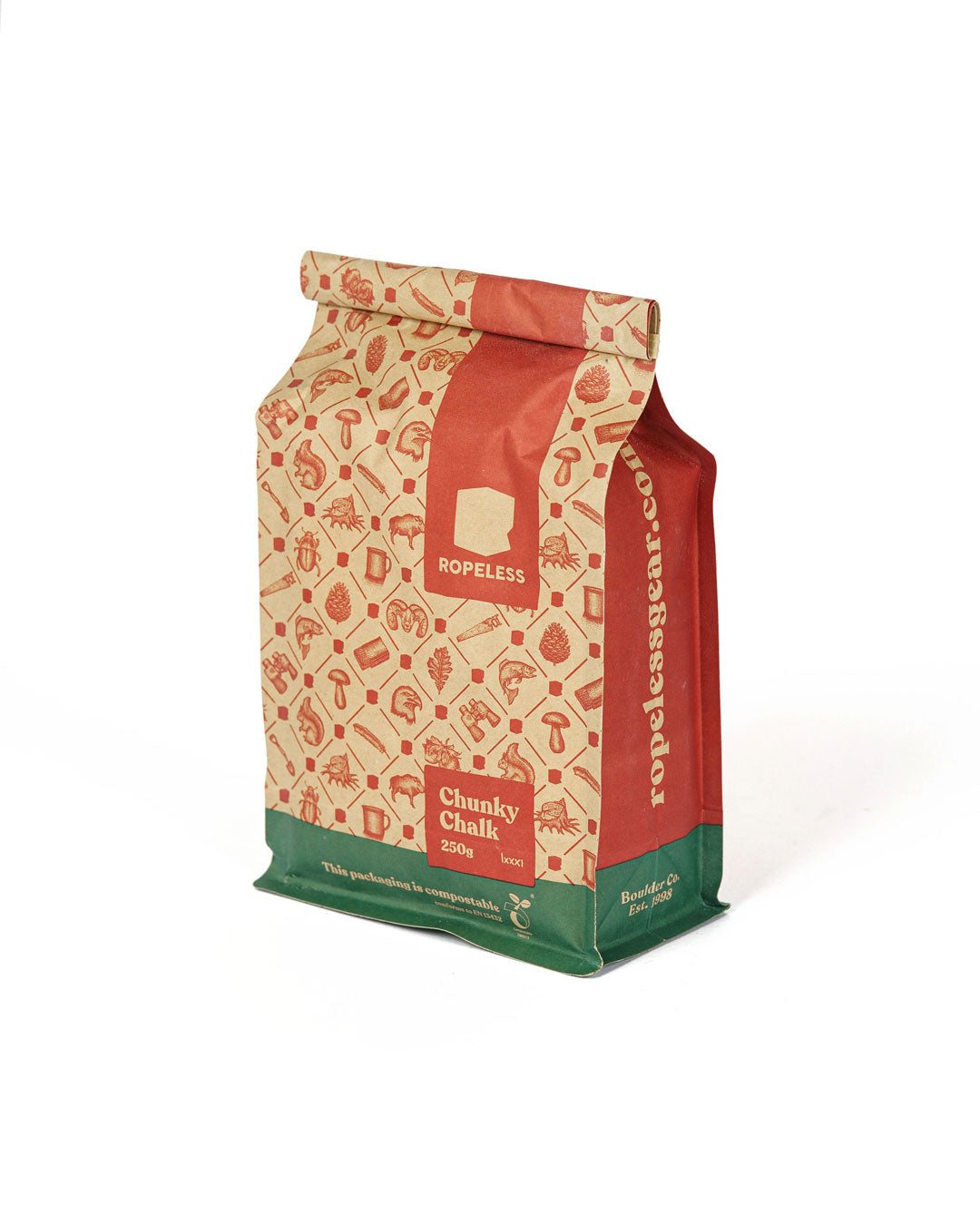 Filled with some nice big chunks made from 100% pure Magnesium Carbonate in a sustainable packaging. ropeless chunky chalk is packaged in a biodegradable craft paper package and is sustainable compared to a lot of the usual plastic zipper packaging.
